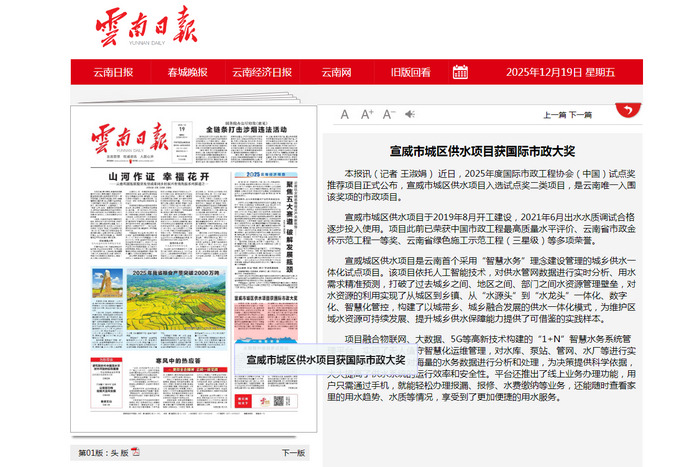 - 《云南日?qǐng)?bào)》頭版:宣威市城區(qū)供水項(xiàng)目獲國(guó)際市政大獎(jiǎng)